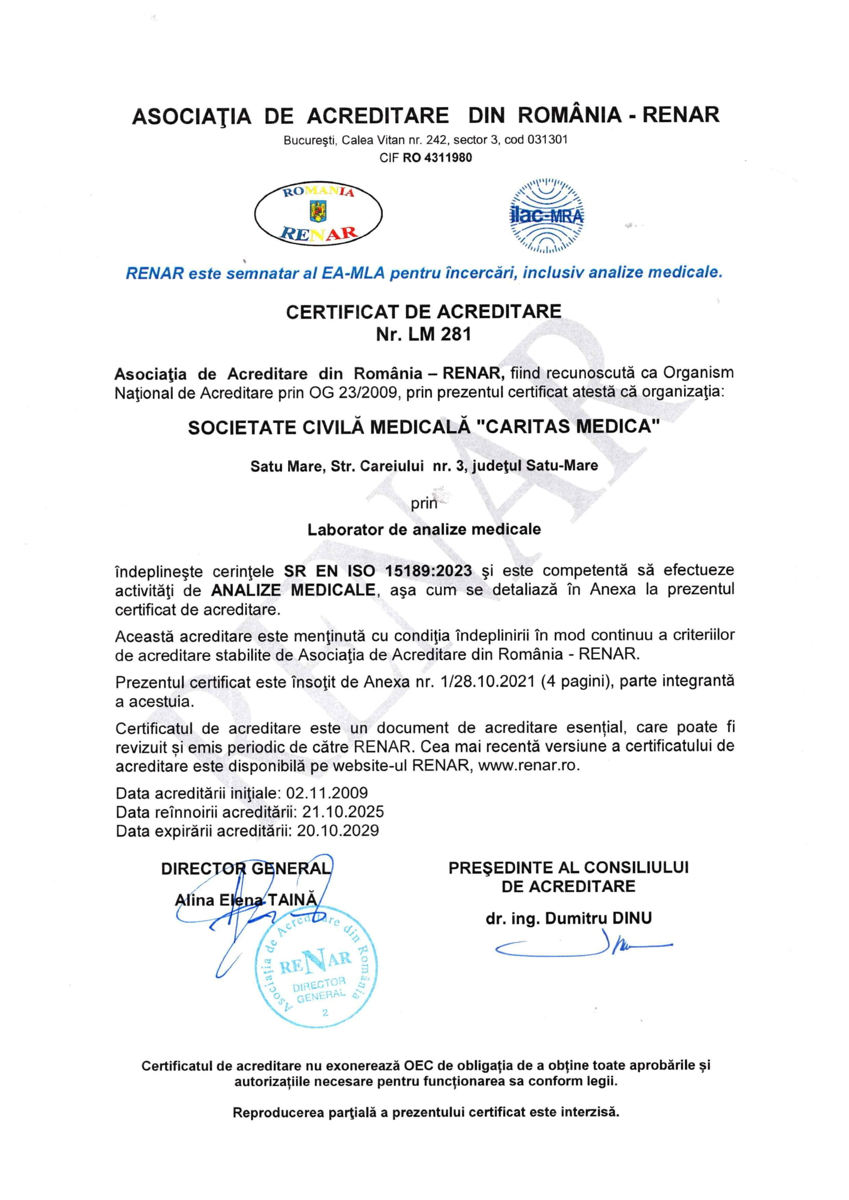 Laboratorul nostru este acreditat RENAR conform standardului SR EN ISO 15189:2023